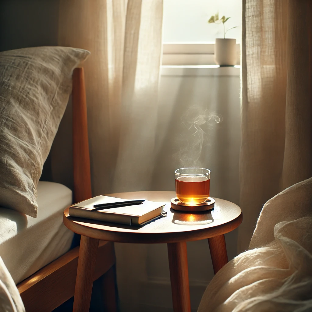 A minimalistic, serene scene with a journal displaying “I Am in Balance,” a cup of herbal tea, and calming natural elements for mindfulness.
